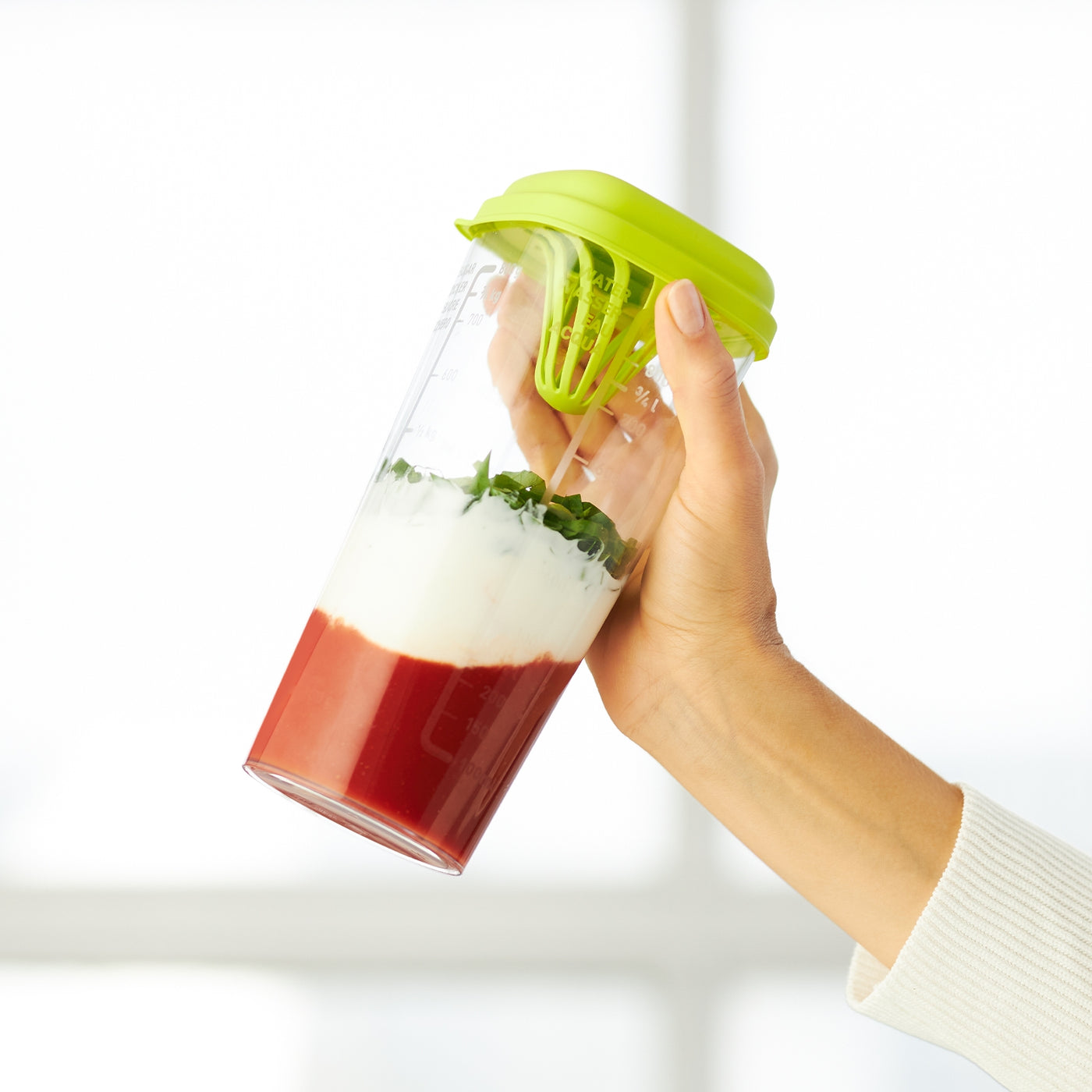 Cet appareil de cuisine 5 en 1 est le plus polyvalent parmi les shakers. Qu'il s'agisse de secouer, de mesurer, de mélanger ou de presser - tout est facile avec ce shaker. La tasse à mesurer a différentes échelles pour mesurer l'eau, la farine, le riz et le sucre. Avec le mélangeur à main, vous pouvez mélanger directement dans la tasse et si vous souhaitez stocker quelque chose, le shaker peut être facilement fermé avec le couvercle fourni. Le stockage pratique des sauces, jus et shakes dans le réfrigérateur est également possible, le shaker s'intègre parfaitement dans le compartiment latéral du réfrigérateur. En parlant de jus : grâce au presse-agrumes, de délicieux jus de fruits peuvent être préparés directement dans le shaker puis conservés. Grâce à l'accessoire mélangeur, les vinaigrettes et les shakes sont magnifiquement crémeux. Aide de cuisine indispensable Le récipient lui-même a une échelle facile à lire et est donc idéal comme tasse à mesurer. Le couvercle ferme le shaker en toute sécurité, ce qui vous permet de ranger facilement vos vinaigrettes et vos pâtes. De plus, le presse-citron vert ou l'accessoire mélangeur peuvent être placés sur la tasse et garantissent ainsi un travail propre et simple dans la cuisine. Mesurer, mélanger, verser : le tout avec un seul produit.